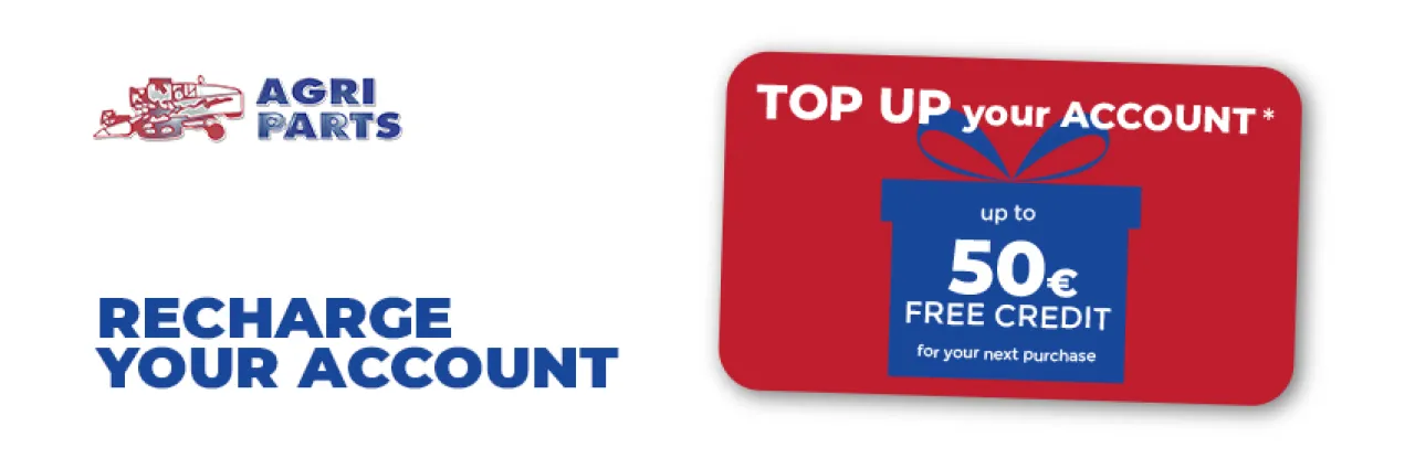 Elija el tamaño de la recarga que desea comprar en la sección 'Plafond' de su perfil, una vez que haya iniciado sesión, y proceda con el pago. Atención, no es posible realizar un pedido de productos y una recarga al mismo tiempo. Si paga una recarga con tarjeta de crédito, Paypal o Satispay con un pago exitoso, el saldo de su cuenta se actualizará al mismo tiempo. Si paga una recarga mediante transferencia bancaria, el saldo se actualizará cuando Agri Parts reciba correctamente su transferencia.